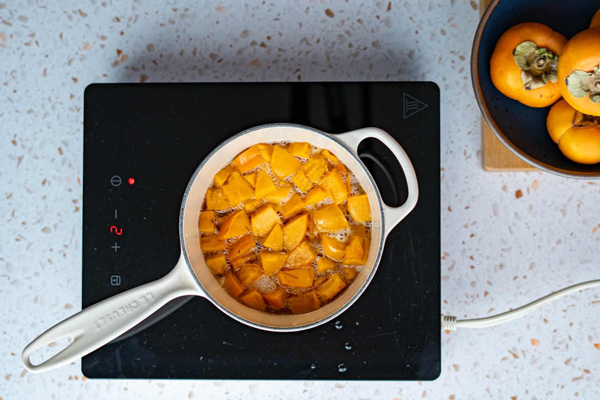 در دومین مرحله از طرز تهیه شیره خرمالو، آب را در یک قابلمه کوچک بریزید و روی حرارت متوسط قرار دهید تا گرم شود. این مرحله پایه اصلی برای تهیه شیره خرمالو است و باعث میشود خرمالوها هنگام اضافه شدن به قابلمه، به خوبی نرم شده و عصارهشان آزاد شود. اگر به عطر و طعم خرمالو علاقه دارید، پیشنهاد ما به شما طرز تهیه مارمالاد خرمالو است.