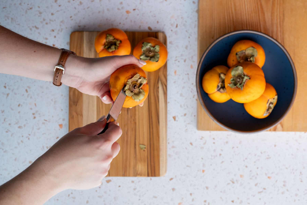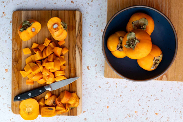 در اولین مرحله از طرز تهیه شیره خرمالو، چهار عدد خرمالو رسیده و سالم را خوب بشویید. آنها را با یک دستمال تمیز خشک کنید. برگها و هسته خرمالو را جدا کرده و دانهها را خارج کنید. حالا خرمالوها را به شکل مکعبی درشت خرد کنید تا سطح بیشتری از میوه با شربت در تماس باشد و فرآیند پخت و عصارهگیری سریعتر و یکنواختتر انجام شود. برای آشنایی با طبع این میوه پاییزی، مطلب طبع خرمالو را بخوانید.