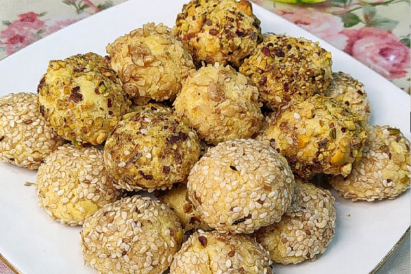 نکته ۲: با توجه به ذائقهتان میتوانید نیمی از شیرینیها را داخل گردو خردشده یا بادام خردشده بغلتانید.