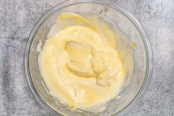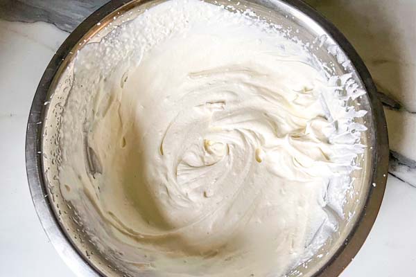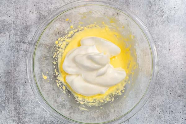 در چهارمین مرحله از طرز تهیه شیرینی لطیفه بدون فر، قبل از آب انداختن مخلوط سفیده باید آن را در دو مرحله به زرده اضافه کنید. هر بار با اضافه کردن سفیده، مخلوط را با لیسک به آرامی و به شکل دورانی هم بزنید. این کار را باید به آرامی و با حوصله انجام دهید تا نان شیرینی لطیفه خشک نشود. شاید فکر کنید سفیده تخممرغ را تنها برای کیک و شیرینی میتوان به کار برد در حالی که با خواندن طرز تهیه خامه کیک با سفیده تخممرغ میتوانید خامه این شیرینی را هم خودتان درست کنید.