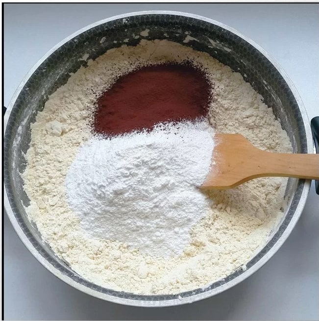 در اولین مرحله از طرز تهیه شیرینی میکادو سفید باید آرد سفید و آرد نخودچی را داخل تابه بریزید. تابه را روی حرارت ملایم بگذارید. آرد را برای ۲۰ دقیقه هم بزنید تا بوی خامی آن کامل گرفته شود. حرارت را خاموش کنید. حال روغن جامد را داخل تابه اضافه کرده و هم بزنید. در ادامه پودر کاکائو و وانیل را اضافه کنید. مجدد مواد را هم بزنید تا مخلوط شوند. پودر قند را داخل تابه الک کرده و هم بزنید. در صورت سفتی مواد باید کمی روغن مایع داخل تابه بریزید. مواد را تا جایی هم بزنید تا خمیر شیرینیتان روان شود. حال که مایه شیرینیتان آماده است پس به سراغ دیگر مراحل تهیه شیرینی میکادو بروید.