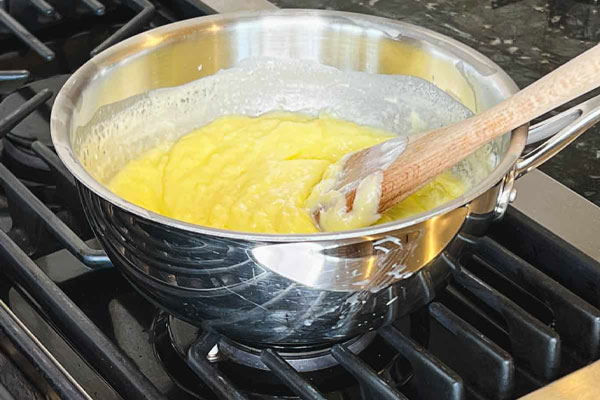 در دومین مرحله از طرز تهیه شیرینی ناپلئونی با خمیر هزارلا باید شیر داغ را آرامآرام به مخلوط تخممرغ اضافه کنید. مخلوط را مدام هم بزنید تا خوب ترکیب شوند. حال تمام مخلوط را به همراه خامه زدهشده داخل قابلمه برگردانید. قابلمه را روی حرارت متوسط بگذارید. مخلوط را برای چهار دقیقه مرتب هم بزنید تا به جوش بیاید. هم زدن مخلوط را تا جایی ادامه دهید که غلیظ شود. حال کره را به مخلوط داخل قابلمه اضافه کنید. با همزن دستی مخلوط را هم بزنید تا کره هم با دیگر مواد ترکیب شود. در نهایت خامه شیرینی را داخل یک کاسه بریزید. پوشش پلاستیک ظرف را گذاشته و آن را برای حداقل دو ساعت یا حداکثر سه روز در یخچال بگذارید.