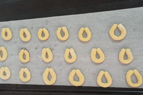 در چهارمین مرحله از طرز تهیه شیرینی نعلی با پیمانه ، نوبت به حالت دادن به خمیر و پخت شیرینیها میرسد. از خمیر به اندازه دلخواه بردارید و آن را به شکل لوله درآورید. به لولههای خمیری حالت نعل اسب یا قطره اشک بدهید. سینی فر را کاغذروغنی پهن کنید و شیرینیها را روی آن با فاصله بچینید. فر را با دمای ۱۵۰ درجه سانتیگراد روشن کنید بعد از گرم شدن سینی شیرینیها را برای ۱۰ دقیقه داخل آن بگذارید تا پخته شوند. در نهایت بعد از ده دقیقه دمای فر را برای چند دقیقه روی ۱۳۰ درجه بگذارید تا شیرینی نعلیهایتان سفت مانده و تغییر رنگ ندهند. شیرینی پنجرهای با پیمانه هم در روزهای عید طرفداران خودش را دارد از آن غافل نشوید.