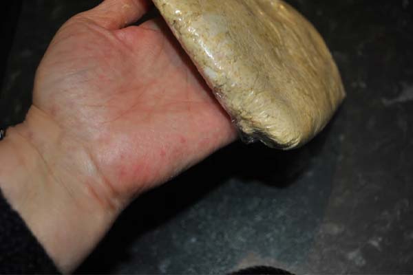 مخلوط داخل کاسه را تا جایی هم بزنید که خمیری نرم و لطیف به دست بیاید. دورگیری را حین هم زدن فراموش نکنید. حال هم‌زن را خاموش کنید و خمیر را با دست برای مدت کوتاهی ورز دهید تا خمیر به دست‌تان نچسبد.