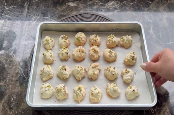 در آخرین مرحله از طرز تهیه شیرینی پفکی گردویی با زرده تخم مرغ باید مایه شیرینی پفکی گردویی را با قاشق به فاصله دو و نیم سانتیمتر روی کاغذ روغنی بریزید. با قاشق اطراف آن را جمع کنید تا گرد شود. روی هر یک از شیرینیها یک تکه گردو قرار دهید. سینی را مجدد داخل فر بگذارید. ۱۵ دقیقه زمان برای پخت این شیرینیها کافی است. با قهوهای شدن روی شیرینیها، فر را خاموش کنید. کمی زمان دهید تا شیرینیها خنک شوند سپس آنها را برداشته و داخل ظرف موردنظر بچینید. روی آنها را با خلال پسته و بادام تزئین کنید. از درست کردن کوکی گردویی غافل نشوید.