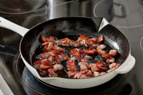 ۵. بیکن و سیب زمینی‌ها را داخل تابه برگردانید