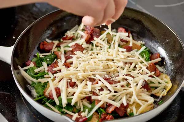 در ادامه طرز تهیه فریتاتا باید سیب‌زمینی و بیکن‌های سرخ شده را داخل تابه برگردانید. آن‌ها را با اسفناج‌ها کمی تفت دهید. سپس پنیر رنده شده را به شکل یک لایه پُر روی سبزیجات پخش کنید. در تابه را ببندید.  پنیر کم‌کم پخته و آب می‌شود. از طرز تهیه کیش اسفناج غافل نشوید که همانند فریتاتا یک وعده غذایی سبک و خوشمزه به حساب می‌آید.