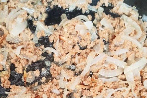 در مرحله دوم، برای تهیه مایه ماکارونی بایدسویا را شسته و بهمدت نیم ساعت در آب سرد خیس کنید. همزمان، سه عدد پیاز خردشده یا رندهشده را با روغن سرخ کنید تا طلایی شود. قارچهای شسته و خردشده را آماده کنید. حال سویای آبکششده را به پیاز اضافه کنید و هم بزنید تا خوب سرخ شود.