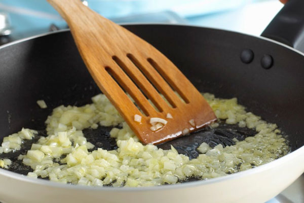 برای شروع کمی روغن در یک تابه بزرگ بریزید و اجازه دهید گرم شود. سپس پیاز خردشده را به روغن اضافه کنید و چند دقیقه تفت دهید تا سبک و طلایی شود. سیر ریز شده را هم به تابه اضافه کرده و یک دقیقه دیگر تفت دهید تا عطرش فضای آشپزخانه را پر کند.