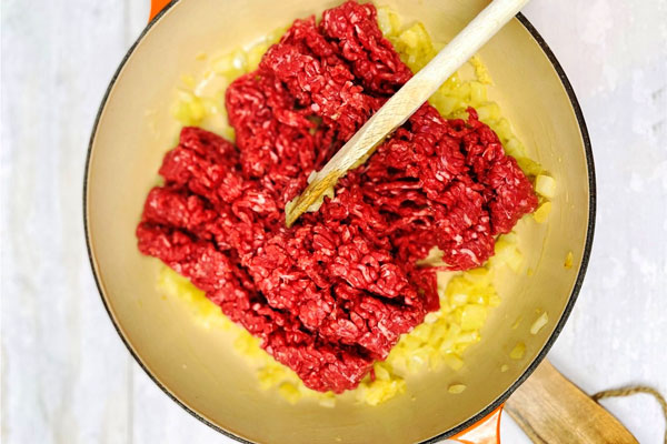 حالا گوشت چرخکرده را به ترکیب اضافه کنید و هم بزنید تا رنگش تغییر کند و آب آن تبخیر شود. بعد از سه تا چهار دقیقه نمک، فلفل سیاه، زردچوبه، پاپریکا و آویشن را اضافه کنید و اجازه دهید ادویهها با گوشت کاملا ترکیب شوند و طعم سس ماکارونی فرم دار شما کامل بگیرد.