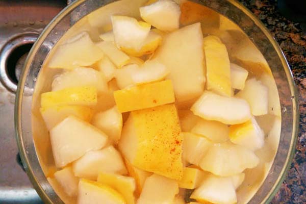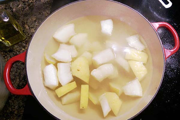 در دومین مرحله از طرز تهیه مربای بالنگ بدون آهک باید بالنگهای خردشده را داخل قابلمه بریزید. به یاد داشته باشید قابلمه را تا جایی آب بریزید که روی بالنگها را بگیرد. قابلمه را روی حرارت متوسط بگذارید تا به جوش بیاید. چهار دقیقه زمان دهید تا بالنگها بجوشند سپس آنها را آبکش کنید. بالنگها را مجدد به داخل قابلمه برگردانید. کار آبکشی بالنگها را سه تا چهار بار تکرار کنید. اگر به دنبال دستور سنتی این مربا هستید طرز تهیه بالنگ با پوست را بخوانید.