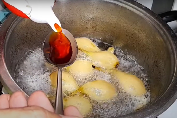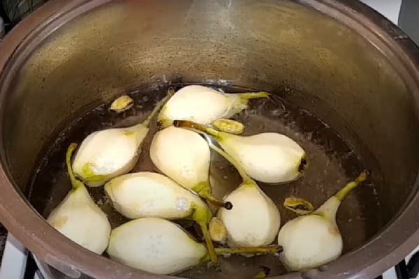 هم‌زمان که شربت مربا در حال آماده شدن است، گلابی‌هایی را که شسته‌اید پوست بگیرید و داخل ظرفی که در آن آب و آبلیموی تازه ریخته‌اید بگذارید تا سطح گلابی‌ها سیاه نشود.