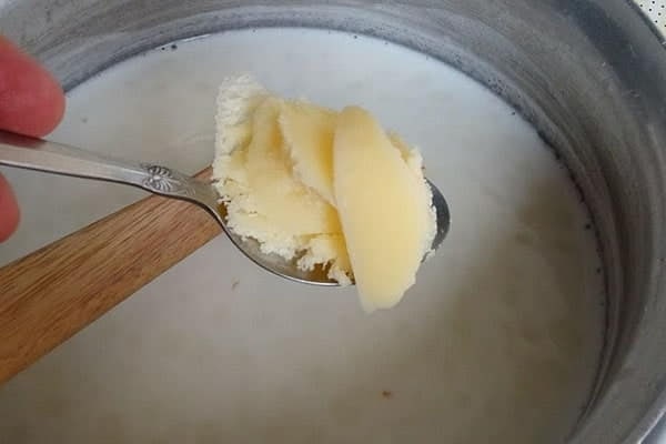 در دومین مرحله از طرز تهیه مشکوفی با شیر باید گلاب گفتهشده را به مخلوط شیر و نشاسته اضافه کنید. مخلوط را خوب هم بزنید. حال در ادامه کره را داخل قابلمه بریزید تا ذوب شده و کامل با مخلوط ترکیب شود. بهتر است کره به دمای محیط رسیده باشد. با حل شدن کره، نوبت به اضافه کردن زعفران دمکرده میرسد. برای خوشرنگتر شدن دسرتان باید آن را غلیظتر دم کنید.