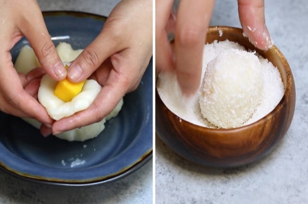 موچی ژاپنی، یک شیرینی با ظاهری گرد است که در پیچاندن آن باید نهایت دقت را به کار بگیرید. در طرز تهیه موچی با آرد گندم ممکن است کمی کار تهیه خمیر موچی با آرد برنجی گلوتینوس سخت باشد. برای راحتی کارتان میتوانید خمیر را کمی ورز دهید سپس داخل یک کاسه کوچک قرار دهید. لبههای آن را به بیرون کاسه باز کنید. سپس فیلینگی که میخواهید را داخل آن بریزید. لبهها را به سمت داخل کاسه جمع کنید. در نهایت خمیر موچی را در کف دستانتان کمی حالت دهید تا شکل گرد به خود بگیرد.
