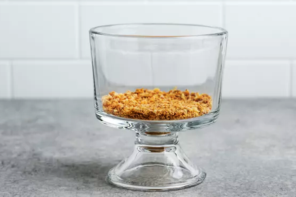 ظرفهای مخصوص سرو خود را انتخاب کنید و نصف پودر بیسکوییتها را به صورت یکنواخت کف ظرفها پخش کنید.