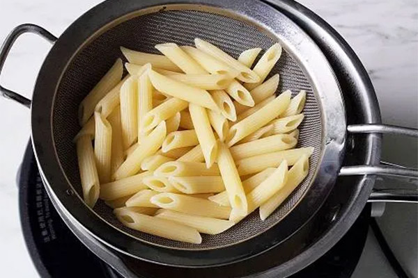توصیه میشود زمان پیشنهادی پخت روی بسته پاستا را بررسی کنید و حدود یک دقیقه زودتر از آن زمان، پاستا را از روی حرارت گاز بلند کنید. حدود یکچهارم لیوان از آب پخت پاستا را نگه دارید، سپس پاستا را در آبکش بریزید، روی آن را بپوشانید و کنار بگذارید.