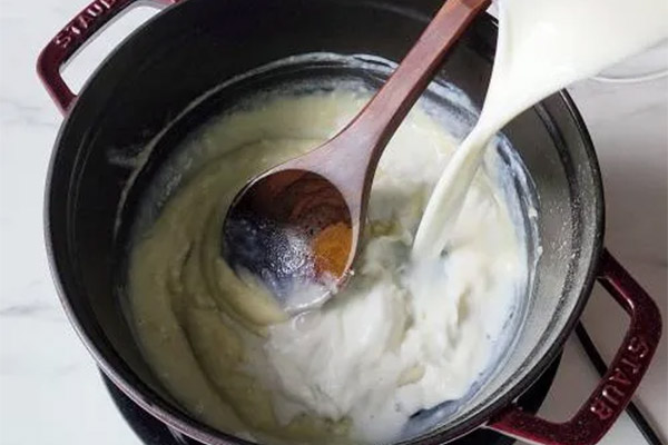 هم زدن را ادامه بدهید تا سس سفید بافتی یکدست و خامهای پیدا کند و گلولهای نشود؛ باقیمانده شیر را اضافه کنید و مجدد خوب هم بزنید. حالا گاز را دوباره روشن کنید و روی حرارت متوسط رو به پایین تنظیم کنید تا سس سفید غلیظ شود؛ مرتب هم بزنید و دیوارههای ظرف را هم بتراشید تا سس کاملاً یکدست بماند. در این مرحله خامه یا پنیر را اضافه کنید و خوب مخلوط کنید.