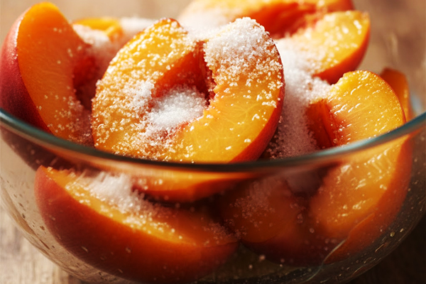 یک ظرف عمیق انتخاب کنید و هلوها را کف آن بچینید، سپس شکر را روی آن بپاشید. حدود یکساعت به آنها زمان دهید تا استراحت کنند، در این بین یک بار هم آنها را زیر رو رو کنید.
