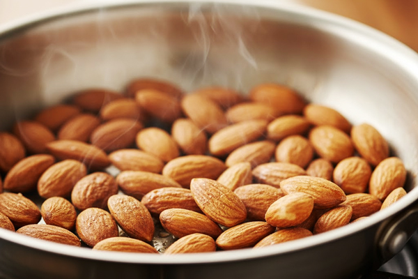 در همین زمان، دانههای بادام را به مقدارم کمی، در حد طلایی شدن، تست کنید تا از حالت خامی خارج شوند، سپس آنها را کنار بگذارید تا خنک شود.