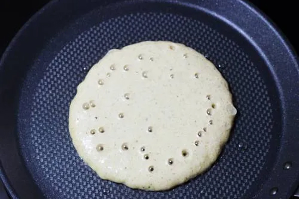 در چهارمین مرحله از طرز تهیه پنکیک رژیمی با جو دوسر، یک تابه نچسب را روی حرارت متوسط رو به بالا گرم کنید. کمی روغن به تابه اضافه کنید تا سطح آن به خوبی چرب شود. مایه خمیر پنکیک جو دوسر را به اندازههای دو قاشق غذاخوری برای هر پنکیک داخل تابه بریزید. اجازه دهید پنکیکها تا زمانی که سطح زیرین طلایی و حبابهایی روی سطح ظاهر شوند بپزند.