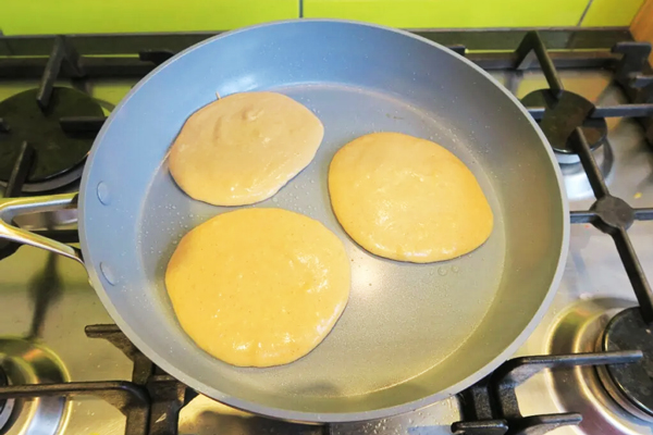از یک ملاقه کوچک برای ریختن مایه داخل تابه استفاده کنید تا ظاهر بهتری پیدا کنند. استفاده از ملاقه کوچک کمکتان خواهد کرد تا مایه کامل کف تابه چرخیده و پهن شود. مایه را نباید بیش از حد بریزید چرا که منجر به خامی پنکیکها خواهد شد. اگر حال و حوصله تهیه این پنکیک جذاب را ندارید، جای نگرانی نیست چرا که میتوانید به آسانی پنکیک ساده تابهای را درست کنید.