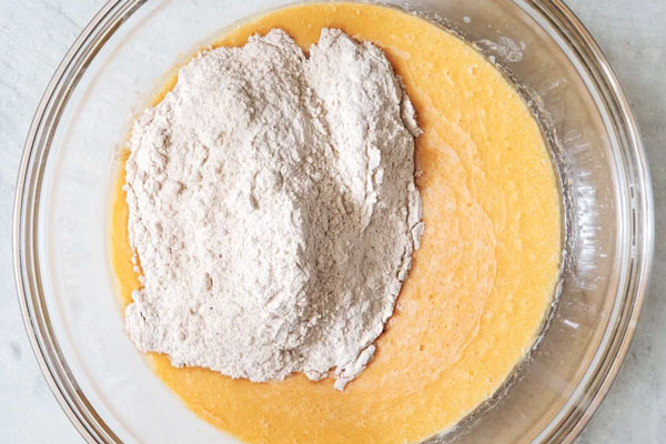 در یک ظرف جداگانه آرد، بیکینگپودر، پودر دارچین، پودر زنجبیل و نمک را با هم مخلوط کنید. این کار باعث میشود ادویهها و بیکینگپودر بهصورت یکنواخت در خمیر پخش شوند و پنکیک بافت بهتری داشته باشد.