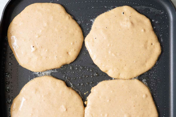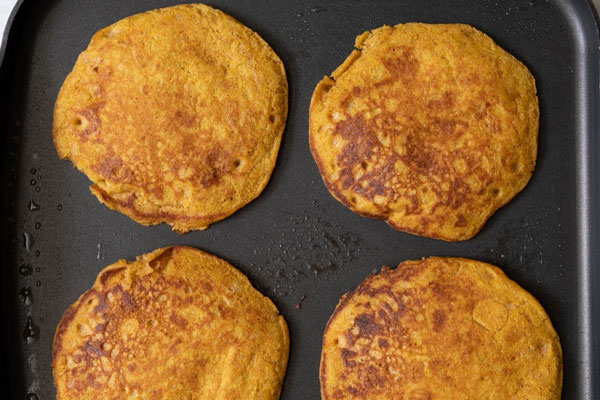 در این مرحله از طرز تهیه پنکیک کدو حلوایی باید یک تابه نچسب را روی حرارت کم قرار دهید و کمی کره یا روغن داخل آن بریزید. اجازه دهید تابه کاملا داغ شود، سپس برای هر پنکیک حدود ۱/۳ پیمانه از مایه را داخل آن بریزید. زمانی که حبابهای ریز روی سطح پنکیک ظاهر شدند و لبهها کمی خودشان را گرفتند، پنکیک را برگردانید و طرف دیگر را تا طلاییشدن بپزید.