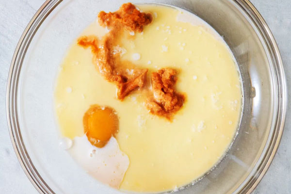 در یک کاسه شیر، پوره کدو حلوایی، تخممرغ، عسل، کره ذوبشده و عصاره وانیل را با هم مخلوط کنید. مواد را با همزن دستی یا چنگال هم بزنید تا ترکیبی یکدست و صاف به دست آید؛ بهطوری که بافت پوره کدو حلوایی کاملا در مایه حل شود.