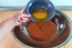 در دومین مرحله از طرز تهیه چیز کیک لوتوس باید کره را به روش بن ماری آب کنید تا شفاف شود. سپس کره آب شده را به بیسکویت‌های پودر شده اضافه کنید. حال مواد را خوب هم بزنید تا با یکدیگر مخلوط شوند و حالتی مرطوب و منسجم به خود بگیرد.