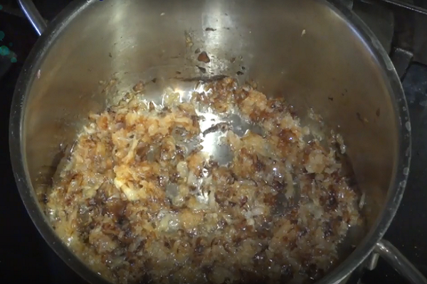 در حالی که بادمجان‌ها در فر هستند، پیاز را خرد کنید و در یک تابه با مقدار کمی روغن تفت دهید تا طلایی شود. سپس سیر، زردچوبه و فلفل سیاه را اضافه کنید و چند دقیقه دیگر تفت دهید تا عطر ادویه‌ها خارج شود.