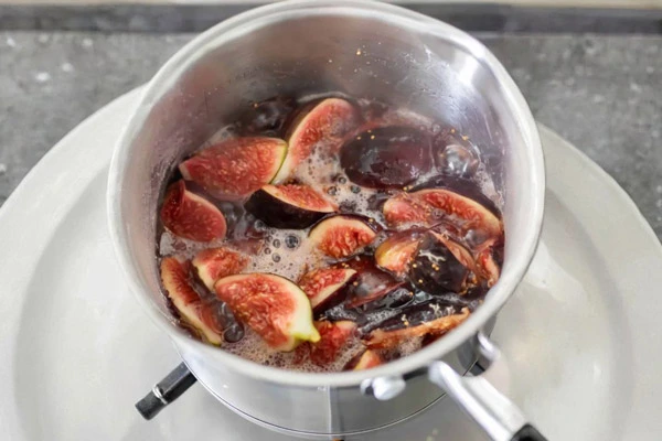 وقتی مخلوط شروع به جوشیدن کرد، حرارت را کم کنید و اجازه دهید حدود ۱۰ دقیقه روی حرارت ملایم بجوشد. هر از گاهی آن را هم بزنید تا انجیرها نرم شوند و ترکیب کمی غلیظتر شود.