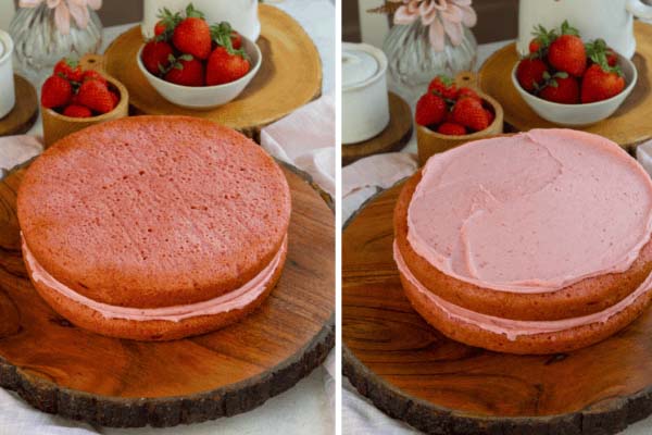 در هشتمین مرحله از طرز تهیه کیک توت فرنگی با کمک یک چاقوی تیز و دندانهدار، یک لایه نازک از روی کیکها را برش داده و صاف کنید. یک لایه از کیک را روی صفحه کیک یا سطح کارتان بگذارید. روی آن را کامل فراستینگ پخش کنید. لایه دوم را هم گذاشته و مجدد فراستینگ را روی آن پخش کنید. دقت داشته باشید که فراستینگ، سطح و کنارههای کیک توت فرنگیتان را کامل بگیرد. در نهایت کیک را حداکثر ۲۴ ساعت یا حداقل ۴۵ دقیقه داخل یخچال بگذارید تا شکل خود را خوب حفظ کند.