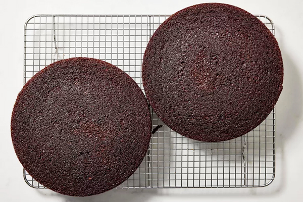 پس از خارج کردن از فر، کیکها را حدود ۱۵ دقیقه در همان قالب بگذارید تا از شوک دمایی جلوگیری و بافت آن حفظ شود. قالب را به آرامی وارونه، روی توری خنککننده برگردانید تا کیک جدا شود. حالا کیکها را دوباره به سمت اصلی برگردانید و اجازه دهید کامل خنک شوند.