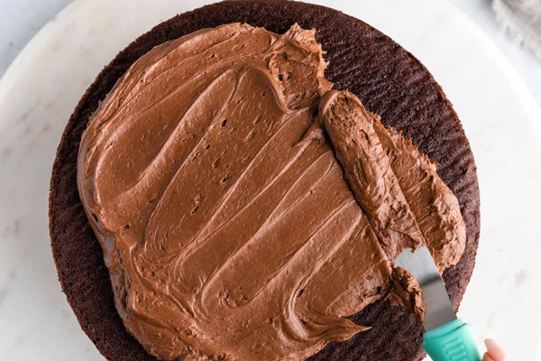 در ششمین مرحله از طرز تهیه کیک خیس شکلاتی کافی شاپی، پس از آن که کیکهای خیس شکلاتی کاملا خنک شدند، آماده پوشش دادن با فراستینگ شکلاتی میشود. ابتدا یکی از کیکها را روی توری خنککننده یا صفحه سرو قرار دهید. با استفاده از کاردک، مقداری از فراستینگ شکلاتی را روی سطح کیک بمالید و آن را به طور یکنواخت پخش کنید. این لایه، پایه لایه دوم و طعمدهنده اصلی کیک شکلاتیتان خواهد بود.