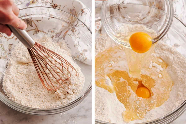 در دومین مرحله از طرز تهیه کیک دارچینی، در یک کاسه بزرگ، آرد، بیکینگپودر و نمک را با هم الک و مخلوط کنید. شکر، کره ذوب شده، شیر، تخم مرغ و وانیل را اضافه کرده و با همزن برقی یا دستی بزنید تا مایه کیک یکدست و صاف شود.
