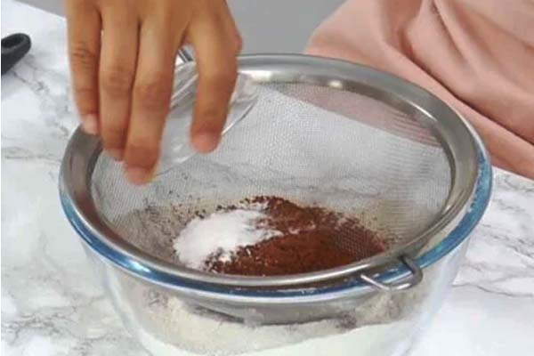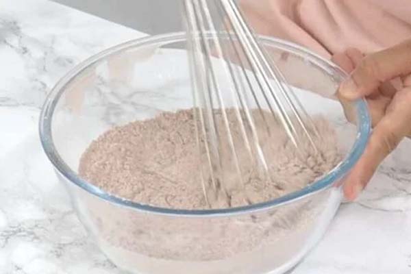 در اولین مرحله از طرز تهیه کیک ردولوت کافی شاپی باید آرد، آرد ذرت، پودر کاکائو، بیکینگپودر، جوش شیرین و نمک را با یکدیگر الک کنید. مواد را با چنگال هم بزنید تا با یکدیگر مخلوط شوند. کاسه را کنار بگذارید. حال فر را با دمای ۱۶۰ درجه سانتیگراد روشن کنید تا برای پخت کیکتان گرم شود. اگر به دنبال طعم جدید هستید حتما طرز تهیه ردولوت با پنیر ماسکارپونه را امتحان کنید.