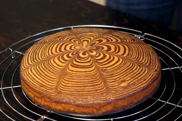 حالا با یک خلال چوبی از مرکز دایره به سمت لبه قالب بکشید تا طرحی شبیه گل ایجاد شود. سپس در فواصل بین خطوط قبلی، از لبه به سمت مرکز بکشید تا طرح گلبرگ مانندی شکل بگیرد که همان طرح زبرا «گورخری» است. این حرکت را هشت تا ۱۰ بار به صورت متقاطع تکرار کنید تا کیک‌تان بعد از پخت متقارن و زیبا شود.