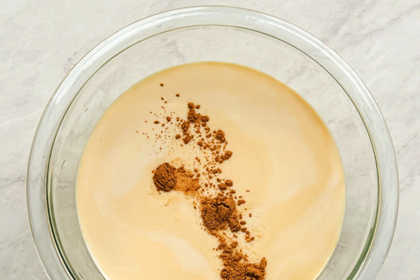 در اولین مرحله از خیساندن کیک باید در یک کاسه متوسط، مواد لازم برای تهیه مخلوط سه شیر شامل شیر پر چرب، شیر عسلی (شیر تغلیظ شده شیرین)، شیر تبخیر شده و پودر دارچین را با یکدیگر مخلوط کنید تا ترکیبی یکدست به دست آید.