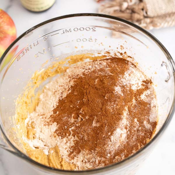در اولین مرحله از طرز تهیه کیک سیب رنده شده و دارچین باید کره و شکر را داخل کاسه همزن بریزید. مواد را با دور متوسط همزن برای سه دقیقه بزنید تا خوب با یکدیگر مخلوط و کرمیرنگ شود. تخممرغها را یکییکی به مخلوط اضافه کرده و خوب هم بزنید. وانیل را هم در انتهای این مرحله داخل کاسه بریزید. مجدد مواد را هم بزنید تا مخلوطی یکدست داشته باشید. در ادامه آرد، دارچین، جوششیرین و نمک را هم داخل کاسه بریزید و هم بزنید. بهتر است آرد را همانند طرز تهیه کیک ساده در قابلمه دو تا سه بار الک کنید.