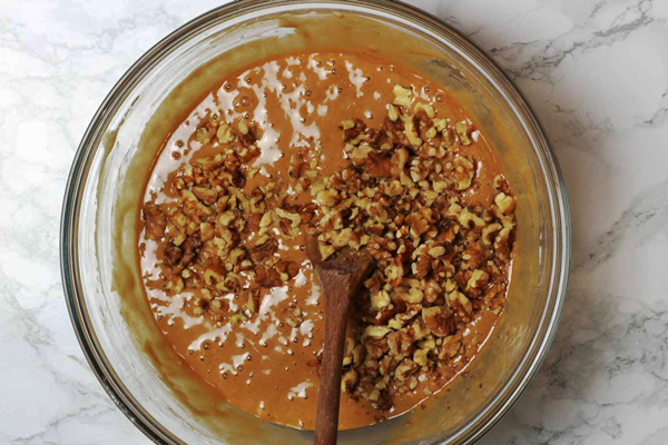 مرحله پنجم: گردو را به مایه کیک اضافه کنید