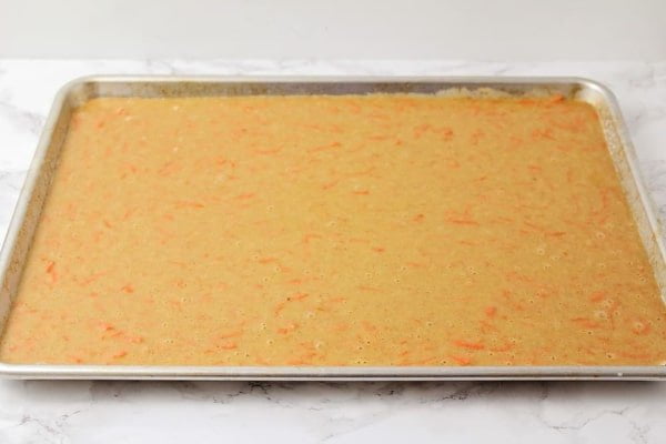 در پنجمین مرحله از طرز تهیه کیک هویج ، مایه خمیر را به صورت یکنواخت در سینی فر بریزید. سینی فر را برای «۲۵ تا ۲۰» دقیقه در فر از قبل گرم شده بگذارید تا کامل پخته شود. کیک هویجتان هنگام پخت باید به رنگ قهوهای طلایی دربیاید. اگر طعم هویج را دوست نداشتید کیک زعفرانی با پف زیاد را امتحان کنید.