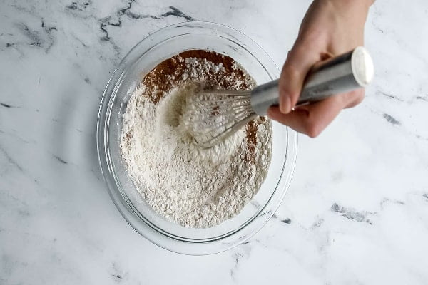 در دومین مرحله از طرز تهیه کیک هویج و گردو دو کاسه مجزا انتخاب کنید. در کاسه اول آرد، جوش‌شیرین، بیکینگ‌پودر، دارچین و نمک را با یکدیگر خوب مخلوط کنید. حتما آرد، جوش‌شیرین و بیکینگ‌‌پودر را سه بار جداگانه الک کنید. حال در کاسه دیگر شکر و روغن گفته‌شده را با هم‌زن دستی آن‌قدر بزنید تا کامل یک‌دست شوند. حال تخم‌مرغ‌ها را یکی یکی بشکنید و به ظرف اضافه کنید. بعد از هر بار اضافه کردن تخم‌مرغ، مخلوط را برای چند دقیقه خوب هم بزنید تا به رنگ کرم دربیاید. حال کم‌کم آرد را به کاسه اضافه کنید و مجدد مواد را با یکدیگر هم بزنید. در صورت نبود فر طرز تهیه کیک هویج بدون فر را بخوانید.