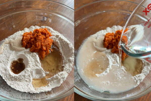 در سومین مرحله از طرز تهیه کیک کدو حلوایی بدون شیر باید در کاسه مواد خشک‌تان دو تا فرورفتگی کوچک و یک فرورفتگی بزرگ ایجاد کنید. داخل دو تا فرورفتگی کوچک را وانیل و سرکه بریزید. در فرورفتگی بزرگ‌تر روغن را بریزید. در ادامه پوره کدو حلوایی و آب را هم اضافه کنید. حال با کمک لیسک، تمامی مواد داخل کاسه را با یکدیگر مخلوط کنید. تا جایی مواد را با یکدیگر مخلوط کنید که خمیر کیک‌تان یکدست شود.