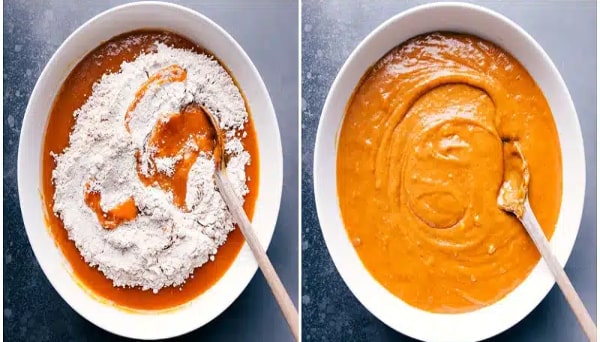 کیک کدو حلوایی را به کیک ادویهها یا کیک تند میشناسند پس در دومین مرحله از طرز تهیه کیک کدو حلوایی در قابلمه به سراغ ادویهها بروید. در کاسهای جداگانه آرد، جوششیرین، دارچین، میخک، زنجبیل، جوزهندی، ادویه کدو تنبل و نمک را با یکدیگر به خوبی مخلوط کنید. بهتر است قبل از اضافه کردن آرد به ادویهها، آن را دو بار الک کنید. حال این مواد خشک را به مخلوط اولی اضافه کنید. مواد را با کمک یک لیسک خوب هم بزنید. دقت کنید که مایه یکدست باشد. با وجود کدو در دسترستان پنکیک کدو حلوایی را به عنوان یک صبحانه مقوی حتما درست کنید.