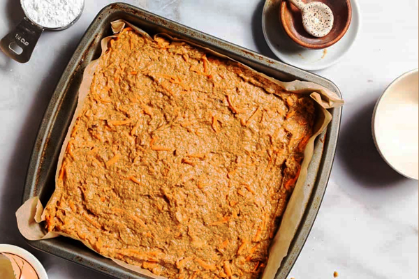 در ادامه هویج رنده شده، گردو و خرما خرد شده را به مایه خمیر اضافه کنید. برای پخش یکنواخت مواد در مایه خمیر، آن را به آرامی هم بزنید. در نهایت، مایه خمیر، را داخل قالب کیک بریزید و سطح آن را با پشت قاشق صاف کنید. از طرز تهیه کیک هویج اسفنجی برای رنگ و لعاب دادن به میهمانیهایتان غافل نشوید.