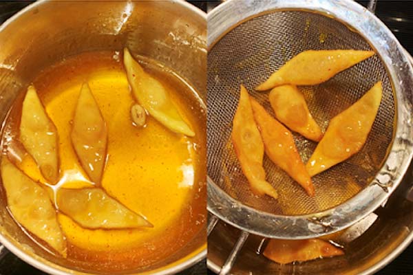 در چهارمین مرحله از طرز تهیه گوش فیل با آرد گندم باید داخل یک تابه گود به مقدار لازم روغن بریزید. روغن که داغ شد، خمیرها را داخل روغن داغ بیندازید تا کامل سرخ شوند. در نهایت گوش‌فیل‌ها را از روغن بیرون بیاورید و داخل شربت خنک‌شده بیاندازید. گوش فیل‌هایتان آماده سرو هستند، پس آن‌ها را داخل ظرف موردنظر چیده و با پودر پسته و نارگیل تزئین‌شان کنید. مطلب طرز تهیه گوش فیل با ماست خوشمزه و ترد را بخوانید تا دیگر سوالی برایتان باقی نماند.