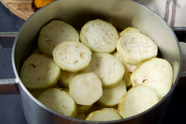 زردچوبه، نمک و فلفل سیاه را با حدود نصف تا یک لیوان آب (بسته به میزان آبدار بودن گوجهفرنگیها) مخلوط کرده و روی مواد داخل قابلمه بریزید. سپس در قابلمه را ببندید و آن را روی حرارت متوسط قرار دهید تا آب داخل قابلمه به جوش بیاید.