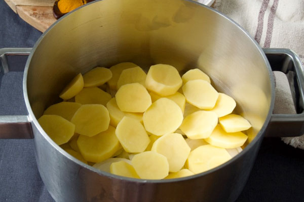 کف یک قابلمه مناسب و ترجیحا نچسب، روغن زیتون را بریزید و پیازهای خردشده را به صورت یکنواخت در کف آن پخش کنید تا هنگام پخت عطر و طعم خود را به سایر مواد بدهند. سپس سیبزمینیهای حلقهشده را روی پیازها بچینید تا در تماس مستقیم با حرارت، بهتر بپزند.
