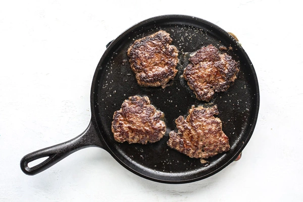 یک ماهیتابه چدنی بزرگ را روی شعله نسبتاً زیاد قرار بدهید. چند دقیقه صبر کنید تا ماهیتابه کاملاً داغ شود. این مرحله خیلی مهم است، چون اگر سطح ماهیتابه به اندازه کافی گرم نباشد، گوشت هنگام پخت به خوبی نمی‌‌پزد و نمی‌تواند آن لایه کاراملی و خوشمزه روی برگر ایجاد شود.